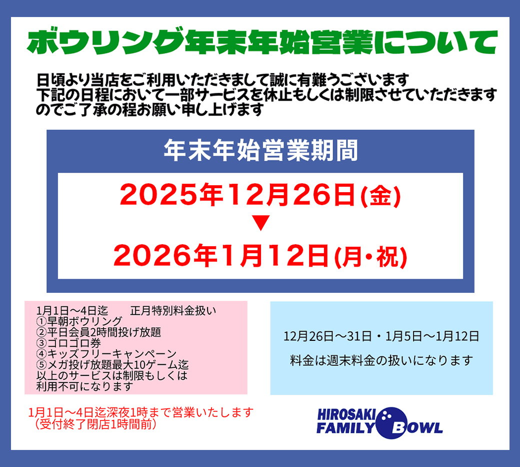 青森県弘前市のボウリング場弘前ファミリーボウル Home 5 ボウリング場一覧 5 弘前ファミリーボウル 弘前ファミリーボウルお知らせ・キャンペーンNEWS・EVENT 弘前ファミリーボウル大会・イベント情報TOURNAMENT 毎月開催・弘前ファミリーボウル・小鹿大樹プロチャレンジ 弘前ファミリーボウル・小鹿大樹プロレッスン&教室 毎週金・土曜日・弘前ファミリーボウル・喜多大介プロボウリング教室 弘前ファミリーボウル店舗詳細SHOP INFO 0172-27-4145 web予約はこちら 団体様・メンバー表ダウンロード フォローフォローフォローフォロー 店舗詳細料金表割引券ギャラリー予定表 営業時間 【年中無休】・月曜日~木曜日/日曜日/祝日AM 10:00~AM 0:00・金曜日/土曜日/祝前日AM 10:00~AM 1:00 住所 〒036-8091 青森県弘前市高崎2丁目15−1 ラフォルテ館 2F 電話番号 0172-27-4145 FAX 0172-27-4149 クレジット・電子決済 料金表 特別営業期間の為、料金の詳細は店舗までお問い合わせください。 パック・投げ放題料金 特別営業期間の為、料金の詳細は店舗までお問い合わせください。 団体予約 卓球 特別クーポン 弘前ファミリーボウル所属プロボウラーPRO BOWLER 喜多 大介プロ JPBA35期生 ライセンスNO,849 座右の銘【チャレンジ!】 タイトル プロ入り 1996年 所属店舗 N&K co., Ltd.弘前ファミリーボウル 資格 日本プロボウリング協会公認C級インストラクター全日本ボウリング協会公認ドリラーブロンズコース 小鹿 大樹プロ JPBA 54期生 ライセンスNo.1346 座右の銘【勝つことは必然ではない】 タイトル 2016プロボウリング男子新人戦 優勝 プロ入り 2015年 所属店舗 N&K co., Ltd.弘前ファミリーボウル 資格 日本プロボウリング協会公認C級インストラクター全日本ボウリング協会公認ドリラーブロンズコース 株式会社N&K運営のボウリング場一覧BOWLING SHOP 都留ファミリーボウル ボウリング施設について ProShopP1都留店 ProShopP1について カラオケスタジアム都留店 カラオケスタジアムについて 弘前ファミリーボウル ボウリング施設について ProShopP1弘前店 ProShopP1について カラオケスタジアム弘前さくら野店 カラオケスタジアムについて 柿田川パークレーンズ ボウリング施設について ProShopP1柿田川店 ProShopP1について 遊キッズサントムーン柿田川店 遊キッズについて 狐ヶ崎ヤングランドボウル ボウリング施設について ProShopP1狐ヶ崎店 ProShopP1について ヤングファラオ ボウリング施設について ProShopP1長野店 ProShopP1について 幸田セントラルボウル ボウリング施設について ProShopP1幸田店 ProShopP1について フォローフォローフォローフォローフォロー