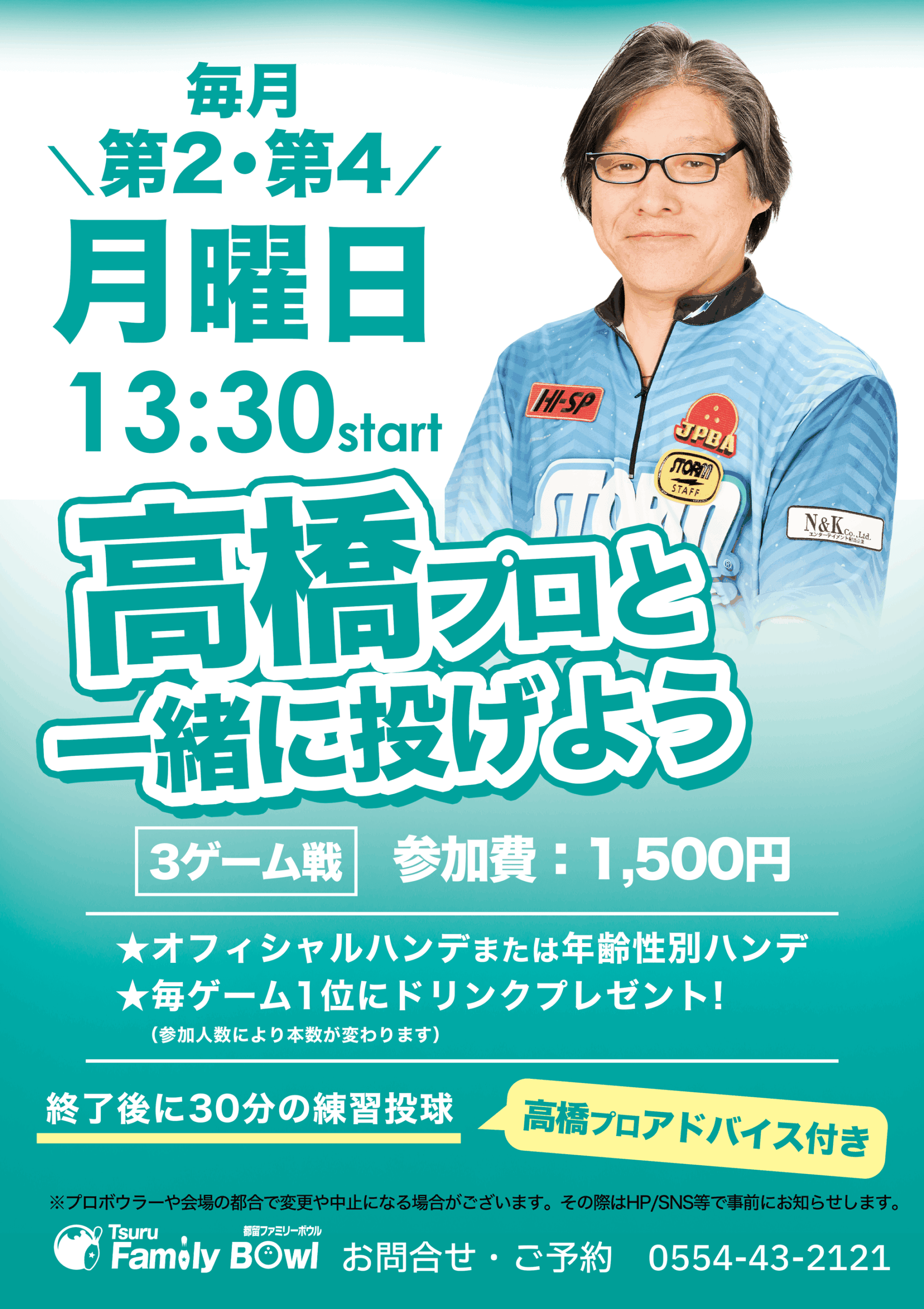 毎月第2・第4月曜日・都留ファミリーボウル・高橋プロと一緒に投げよう