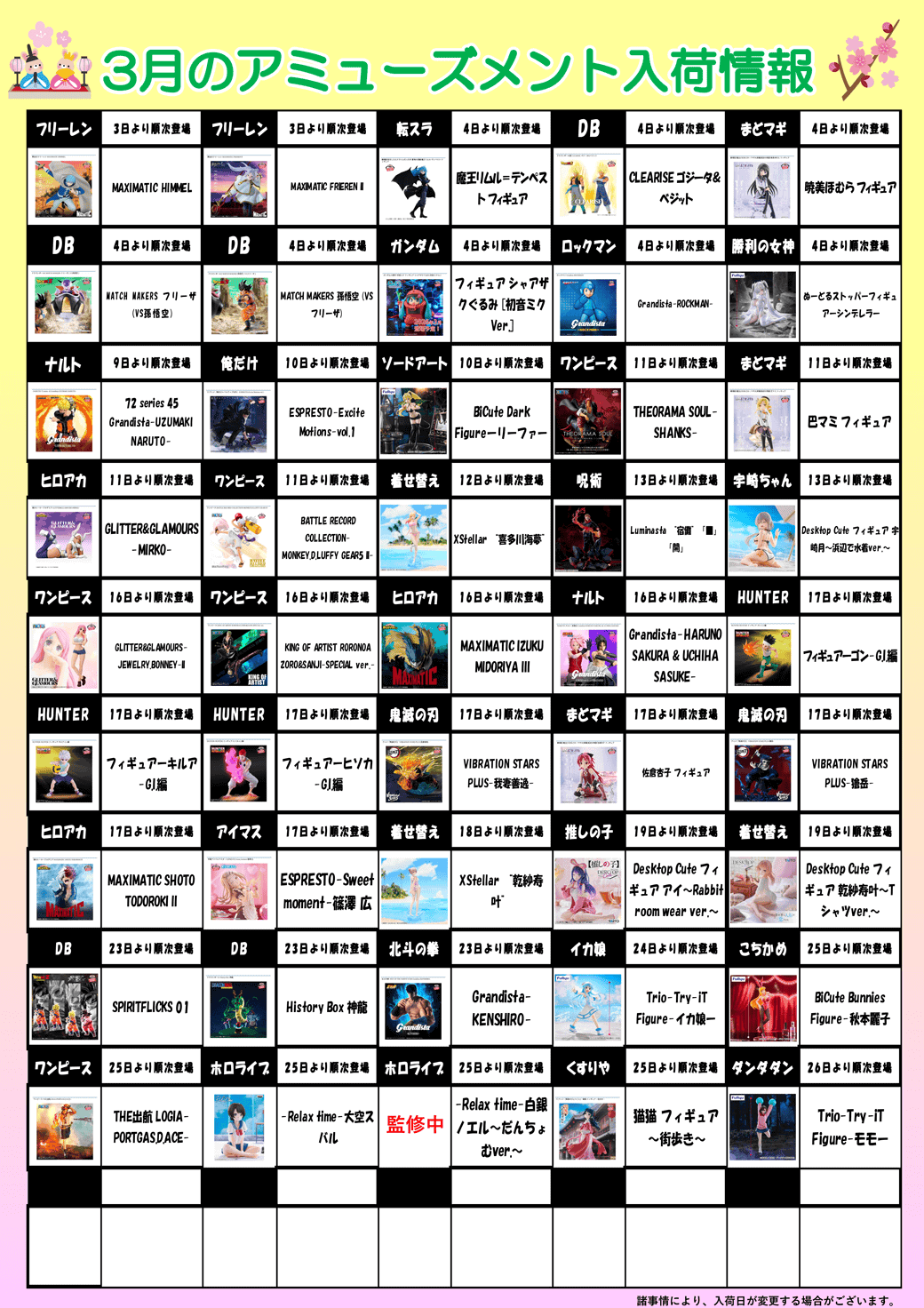 狐ヶ崎ヤングランドボウル内併設アミューズメントコーナー Home 5 狐ヶ崎ヤングランドボウルアミューズメントコーナー 今月の景品情報 店舗情報 住所静岡県静岡市清水区上原1-6-16 イオン清水店3F 電話番号054-345-4161 FAX番号054-345-5260 営業時間【月~金】10:00~23:30 【土・日】9:00~23:30 特別営業時間祝日の場合、月~金は10:00オープン、土日の場合は9:00オープンとなります。 フォローフォロー